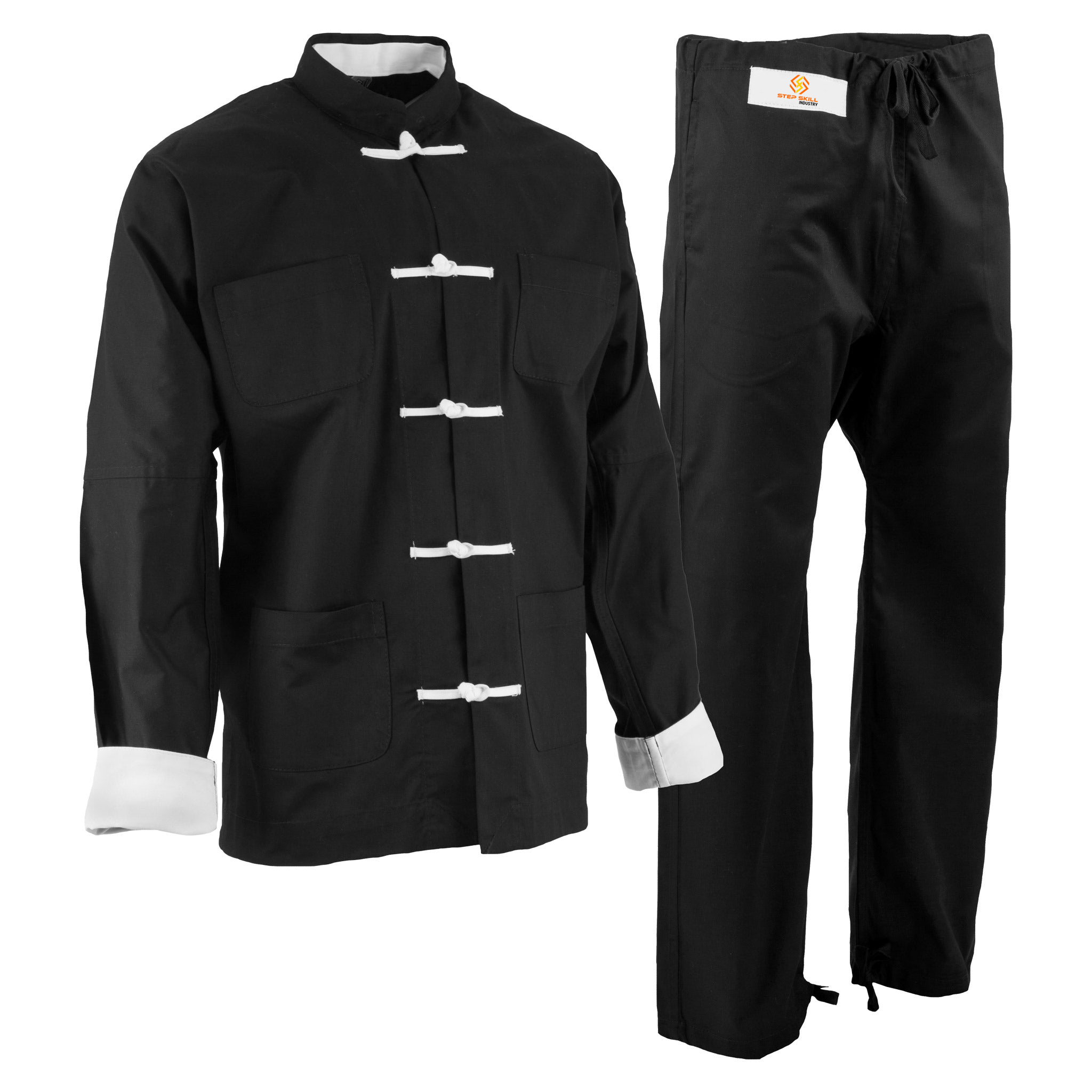 Your choice of white or black, distinctive “frog” buttons are hand finished. The pants have a drawstring waist and cuffs plus a back pocket. Made from a 55% cotton / 45% polyester blend. A Kung Fu sash (sold separately) finishes the uniform.